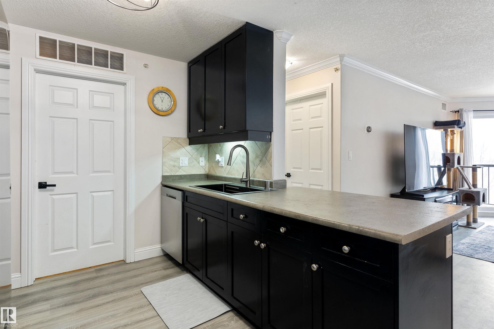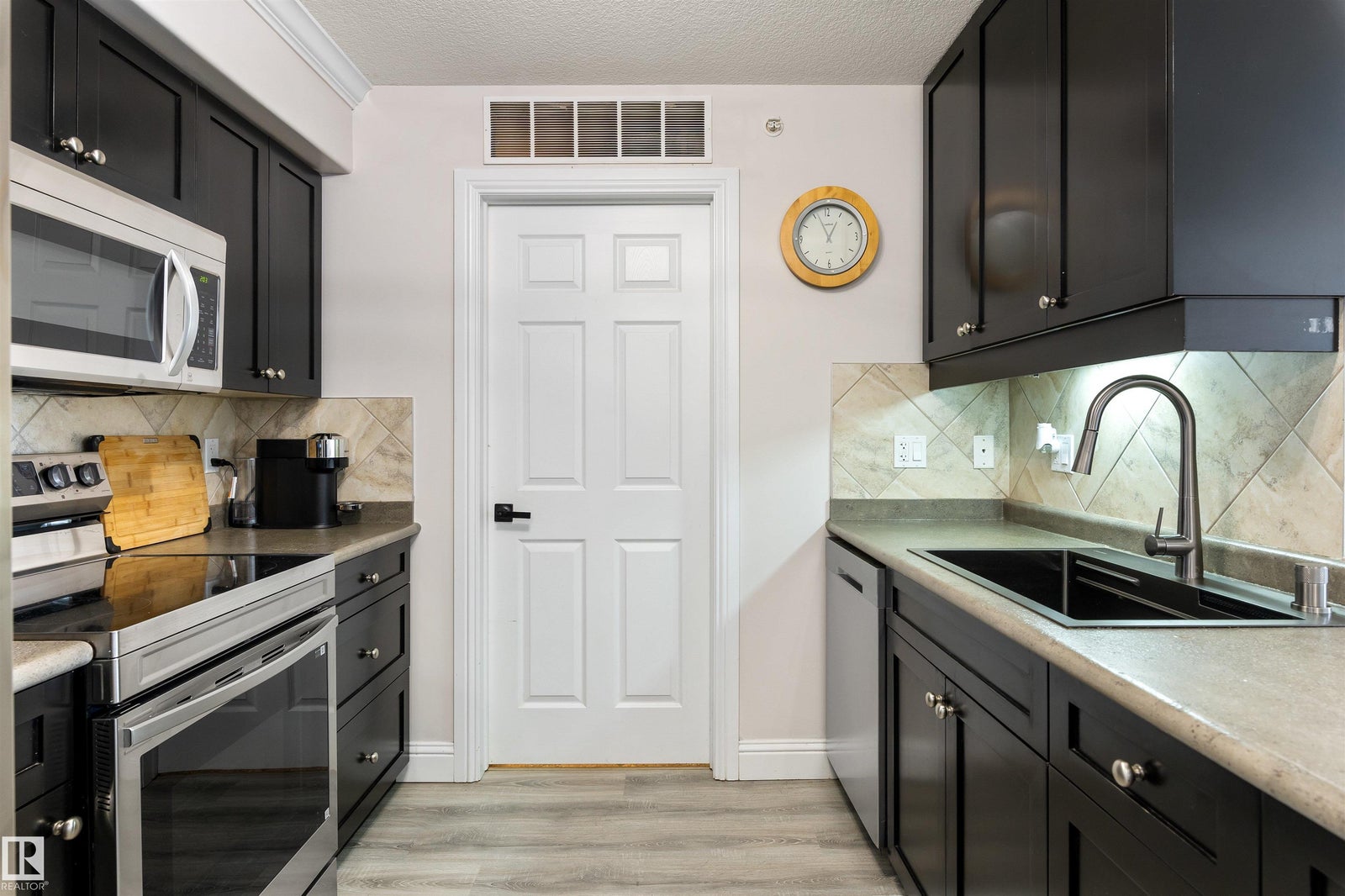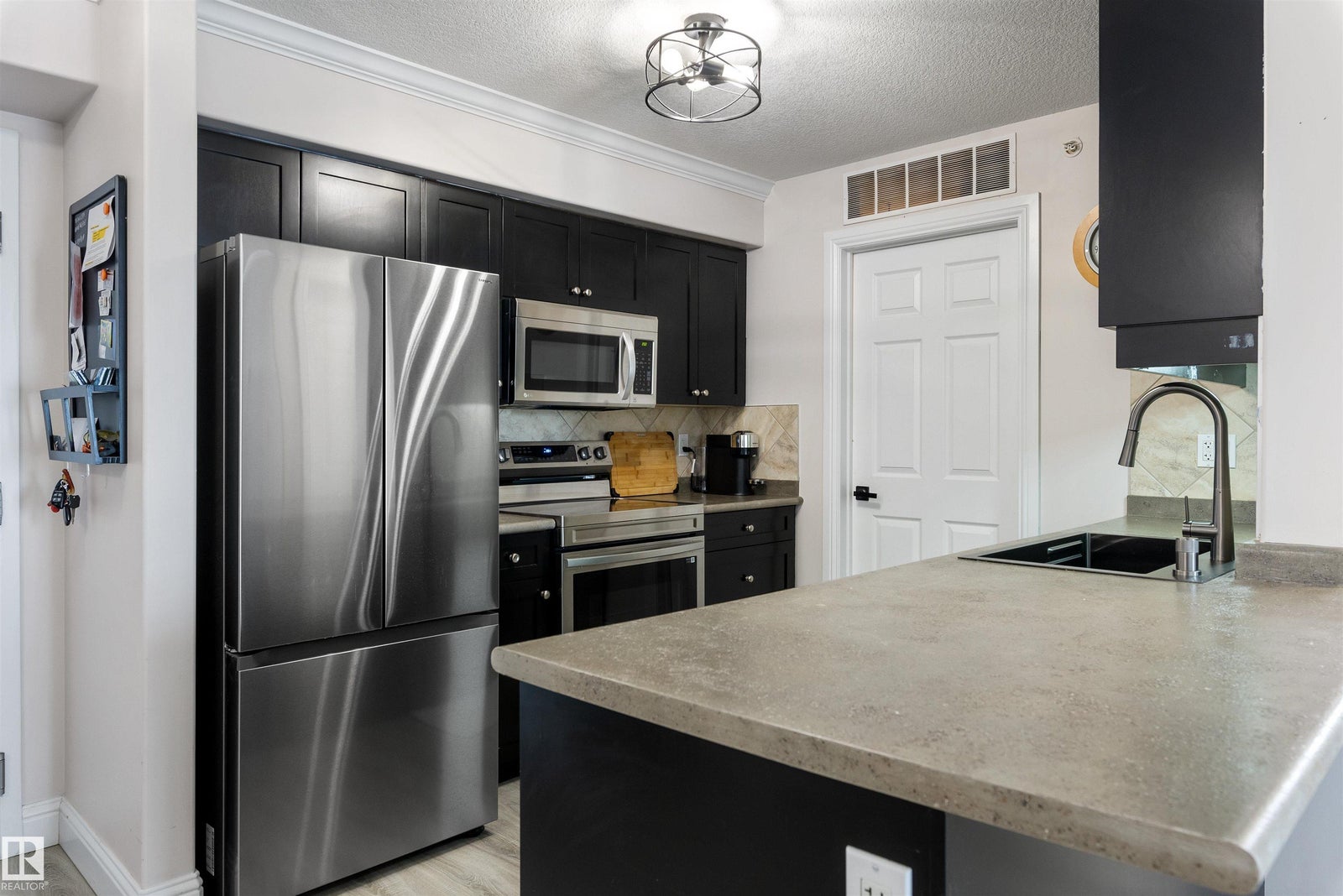 Rare TOP-FLOOR south-facing unit filled with natural sunshine and elegant designer-inspired RENOVATIONS offers an elevated standard of condo living. Flooded with natural light and enhanced by 9’ ceilings, the interior features new laminate flooring, curated paint selections, updated black lighting, stainless steel appliances, sleek countertops, and a deep single-bowl stainless sink, creating a refined and cohesive feel. The OPEN-CONCEPT kitchen, dining, and living area flows seamlessly to a private south-facing balcony with natural gas BBQ hookup, perfect for relaxing or entertaining. The primary suite offers a WALK-IN closet and private 4-pc ensuite, while the second bedroom sits beside the main bath with walk-in shower, creating a well-proportioned layout for owners or guests. In-suite laundry and titled heated UNDERGROUND parking with STORAGE cage add everyday convenience. A rare combination of top-floor privacy, sunlight, and thoughtful upgrades, designed for comfortable, low-maintenance living.